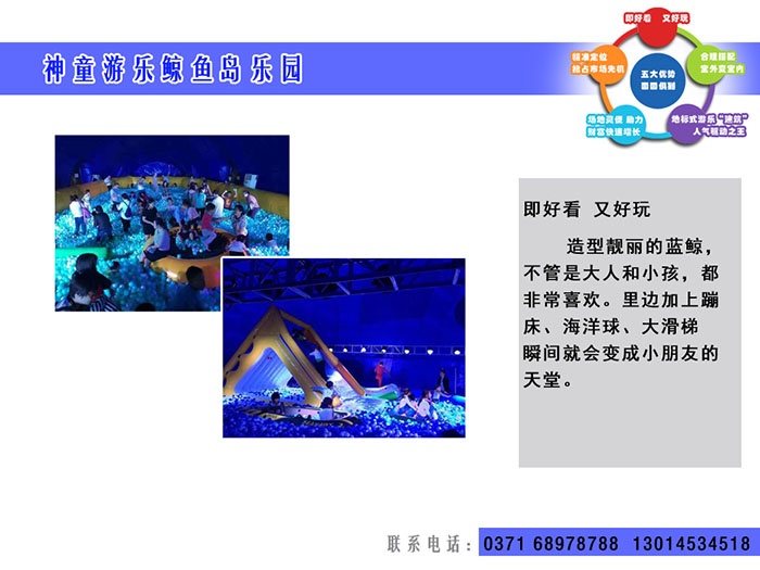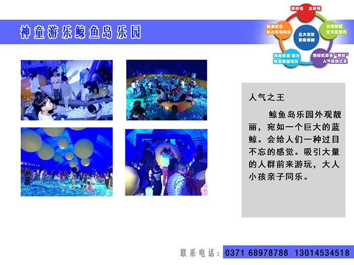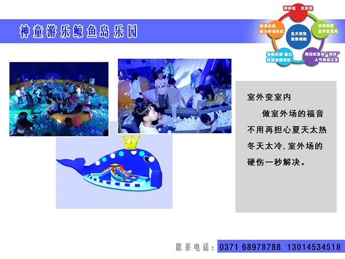 除了外观以外,鲸鱼肚内更是有百万海洋球池,配备有蹦床,迷宫,彩虹桥,旋转椰子树,秋千,滑梯,风火轮,水床,沙滩池,涌梯等游玩设施,百万海洋球乐园,承载着百万海洋球,承载着百万欢乐!
