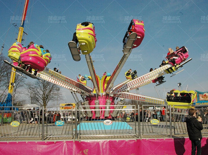 激情跳跃弹跳机是大型游乐设备的一款经典产品,是游乐园必选的游乐设施之一。运行时座舱通过大臂连接围绕中心柱做出旋转起伏升降的动作,整体形成大波浪、小波浪、同起同落等多种起伏运行方式,使游客具有惊心动魄的体验,非常适合大型游乐园和公园经营。座椅采用双保险设计,手动保险更舒适、气动保险更安全,客量大、设备运行平稳,这是一款老少皆宜的游乐设施。